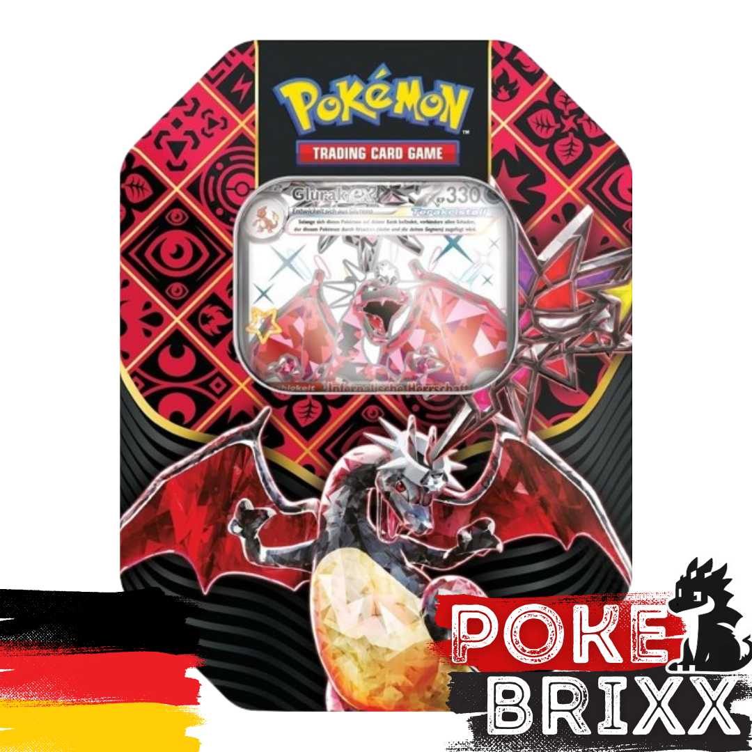 Drei mächtige Schillernde Pokémon-ex sind in einem Trio von Pokémon-Sammelkartenspiel-Tin-Boxen eingetroffen! Du hast die Wahl zwischen dem feuerspeienden Terakristall-Glurak-ex, dem grausamen Eisenrad-ex und dem mysteriösen Riesenzahn-ex, um dein Team zu bilden. Zusätzlich zu den Schillernden Pokémon enthält jede Tin-Box vier Boosterpacks aus der besonderen Erweiterung Paldeas Schicksale des Pokémon-Sammelkartenspiels, um deine Sammlung zu erweitern.